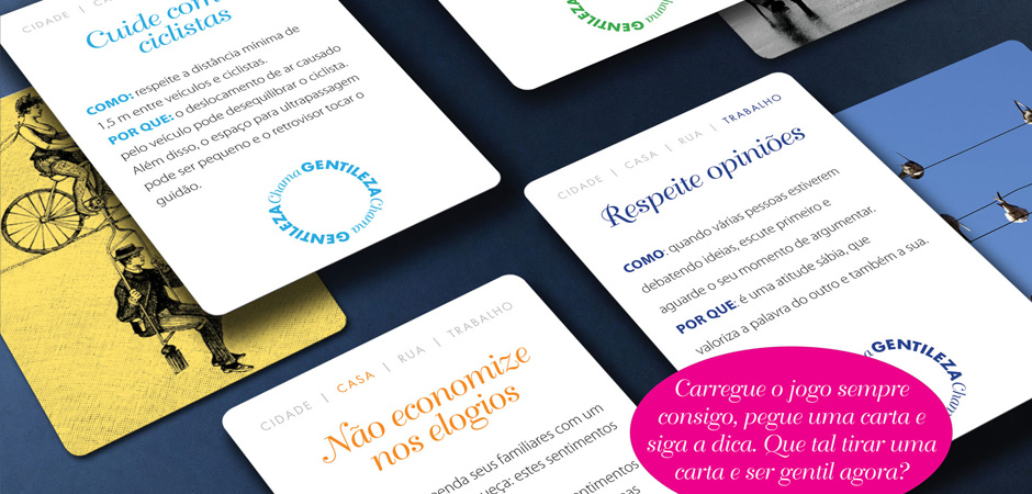 O jogo de cartas “Gentileza Chama Gentileza” foi criado com o objetivo de promover a gentileza urbana. Por meio dele, os jogadores recebem dicas de atitudes gentis que podem ser praticadas na rua, em casa, na cidade e no trabalho. Assim, brincando, é possível melhorar o mundo em que vivemos.